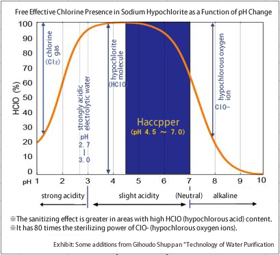 但是,pH 值太低(即酸性太强),会容易产生氯气(Cl2 )。因此通常在 pH5 以上,也就是不容易产生氯气的弱酸性状态下使用哈瑟琶水。