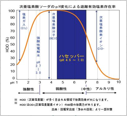 ハセッパーでは、濃度8.5%という低濃度の希塩酸を、極微量に次亜塩素酸ソーダに混合しpH6.0~7.3にすることにより、有効除菌成分である次亜塩素酸(HOCl)を大量に含んだ水を生成するようにしています。(グラフ参照)