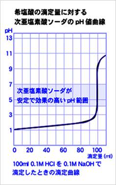 滴定量の少しのズレで、すぐにpH3以下~pH8以上になってしまう事や、pH4.5以下になると塩素ガスが発生する危険があることから、人為的に混合していく事は非常に難しく危険性が伴います。